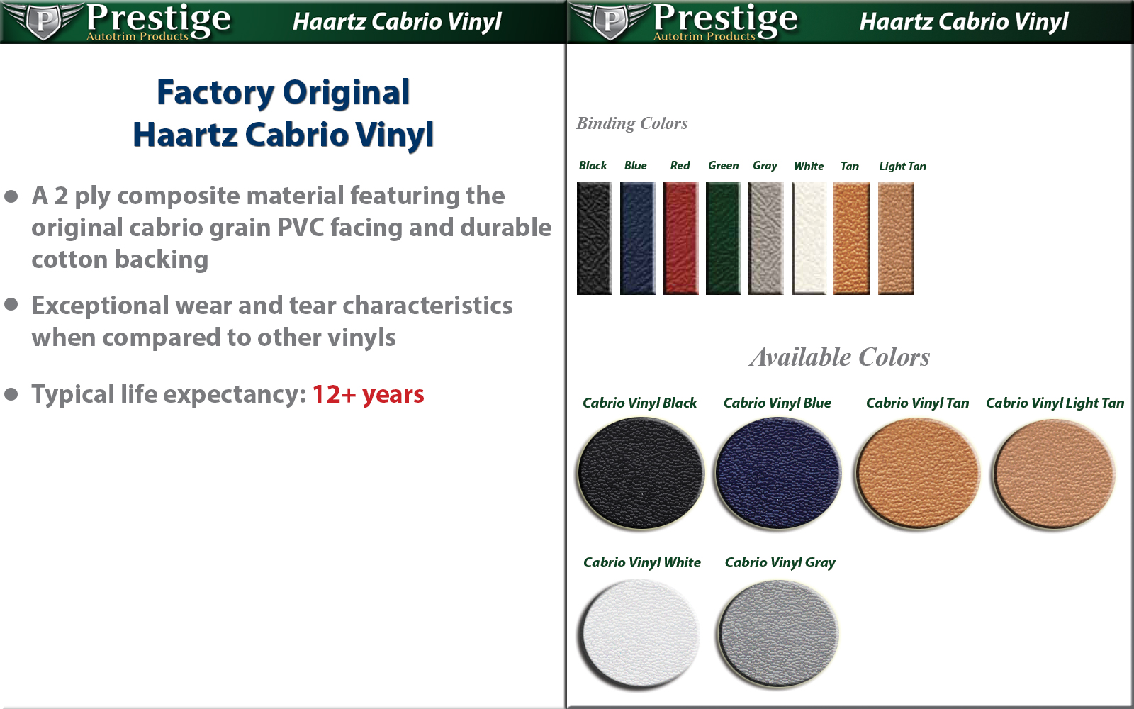 - Made from Factory Original Haartz Cabrio Vinyl with original cabrio PVC grain.